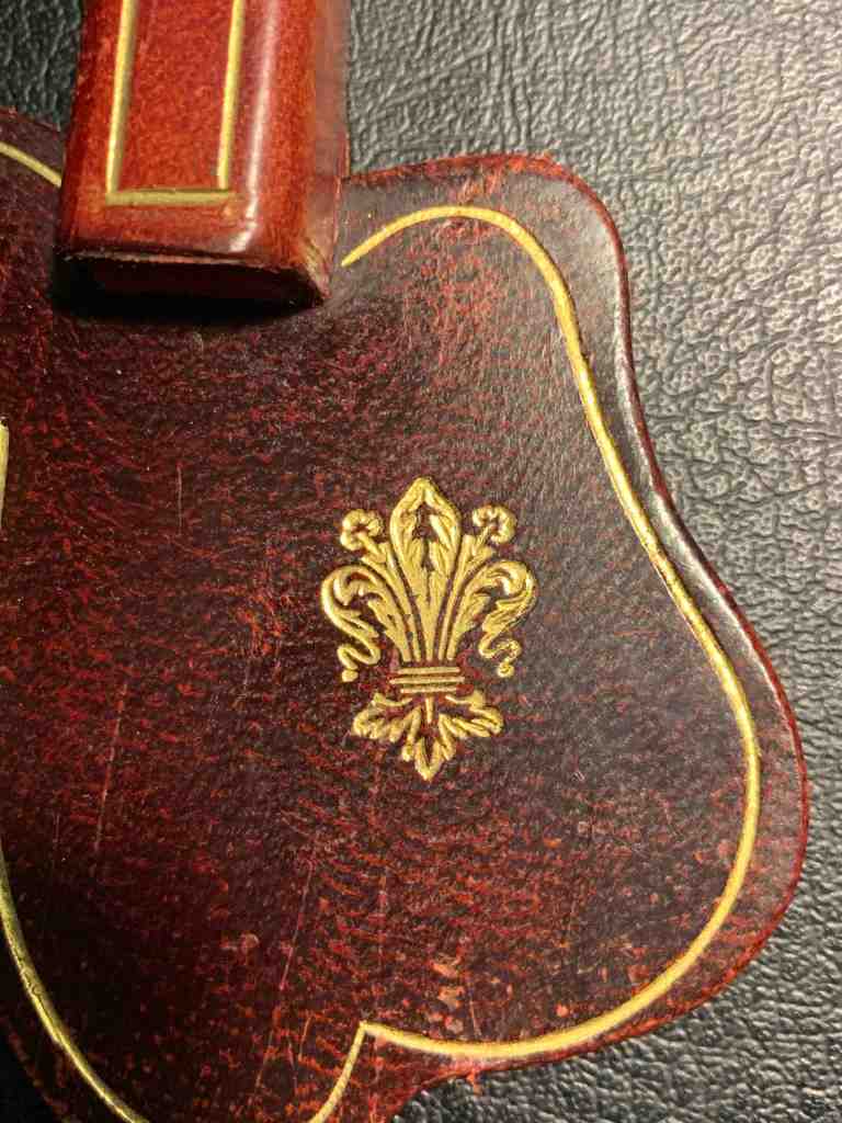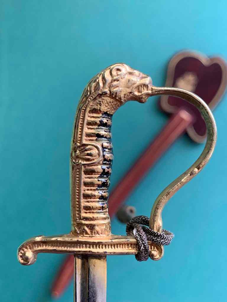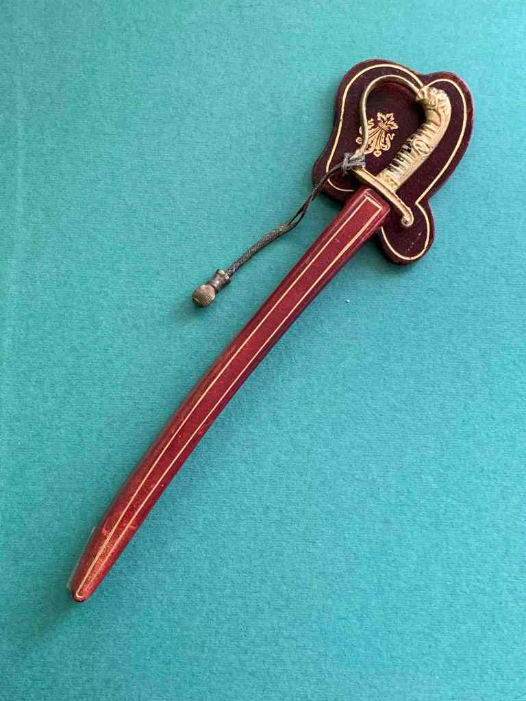 Кожаные ножны. Металлический «клинок» с металлической тяжёлой «кисточкой» на кожаном шнурке. Очень изящная копия офицерской сабли, по словам антиквара, из армии Германской империи конца XIX — начала XX века. Хотя, геральдическая лилия на ножнах свидетельствует о другом. Она очень похожа на герб города Флоренция, Италия.