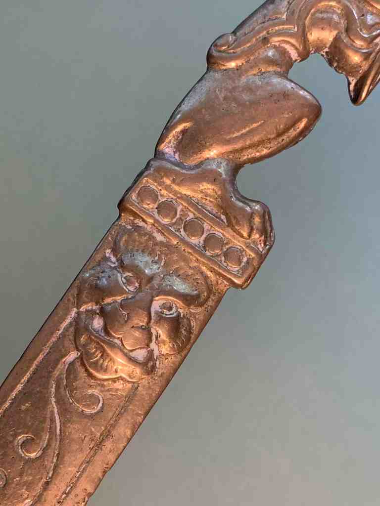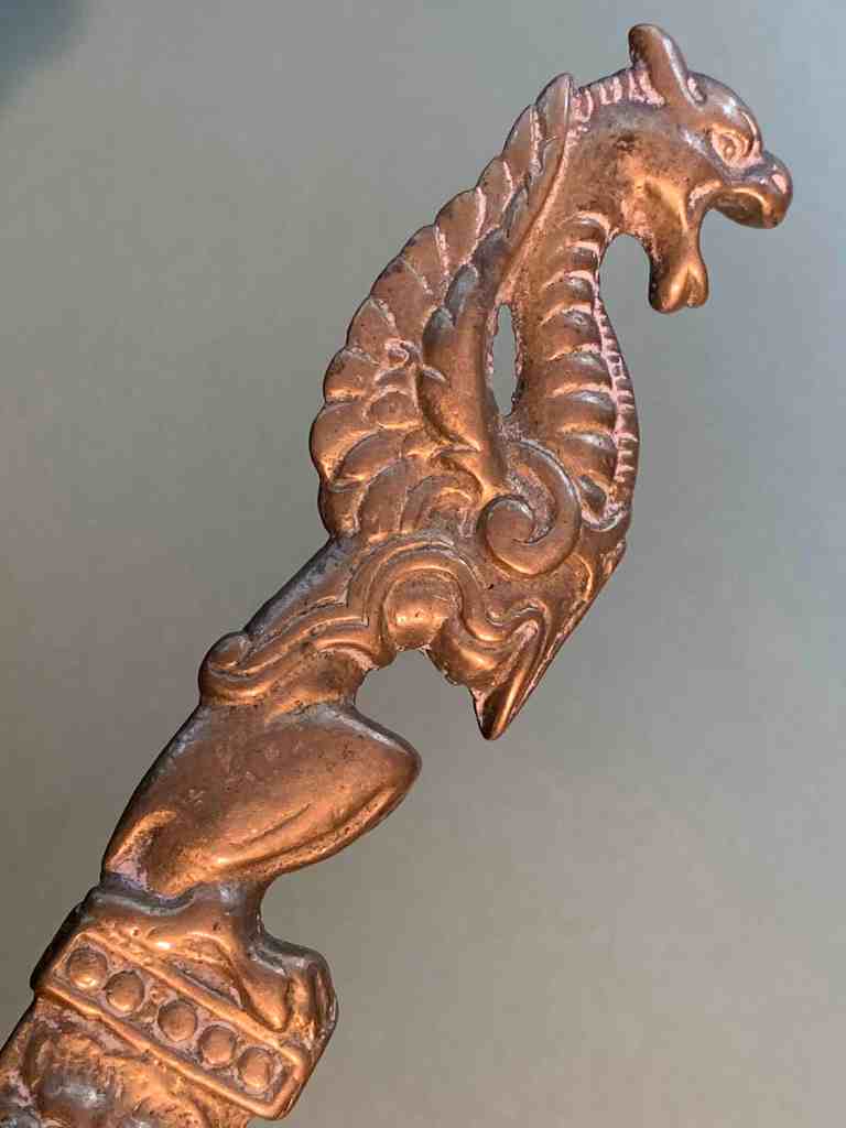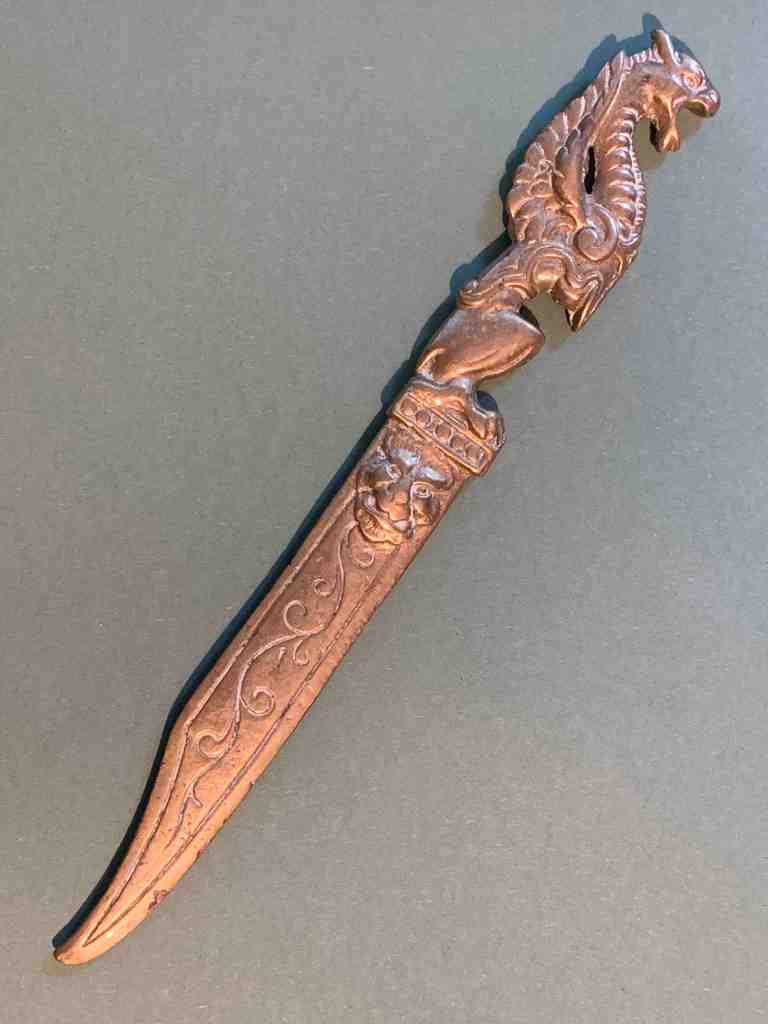 Каталог выставки избранных экземпляров из его коллекции (Letter Openers. Works of Art on the Desk, 2011) описывает этот открыватель писем так: «Германия (?), около 1880 г., тяжёлая кованая бронза, крылатый лев на рукоятке, львиные головы на обеих сторонах соединения рукоятки и лезвия, рисунок цветов на лезвии» (стр. 91).