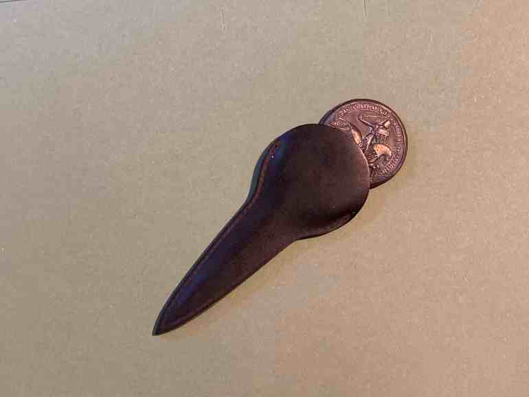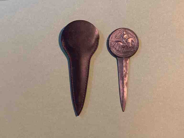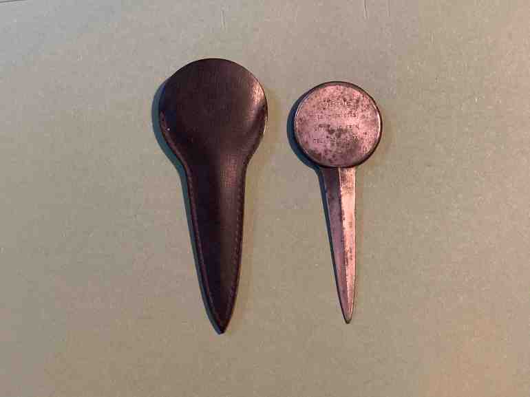 Это может быть необычным открывателем писем, но на самом деле, вполне традиционный сувенир рекламного характера для французских ресторанчиков, в кожаном футляре.