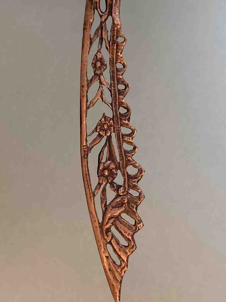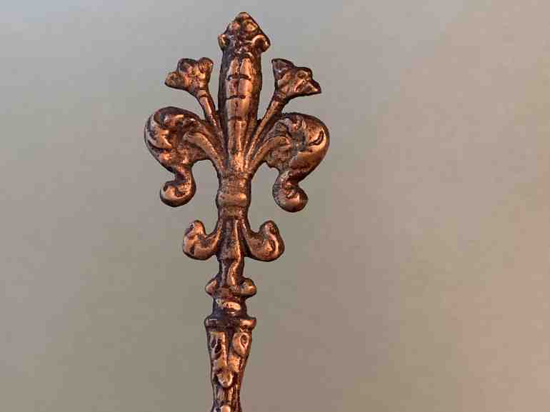 Этот изысканный открыватель писем украшен эмблемой Флоренции — флорентийской лилией. Изогнутое лезвие, с вплетёнными в него цветами, напоминает по форме перо птицы.