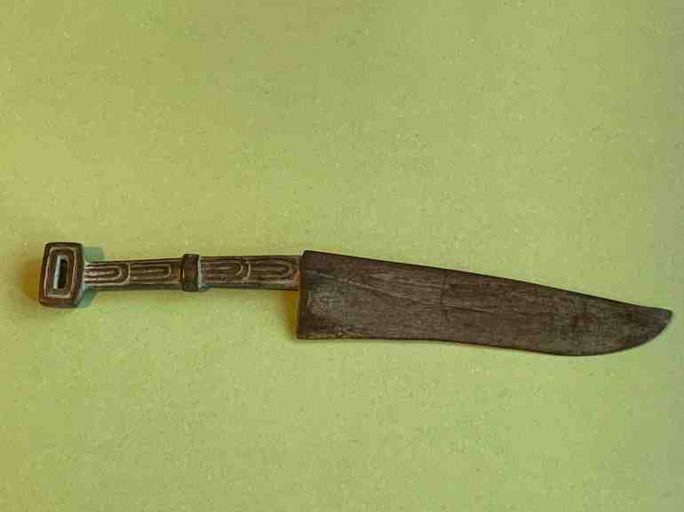 Это — копия монеты в форме ножа, которые были в ходу в Китае в эпоху Западного Чжоу, между XI и VIII веками до н. э., то есть около 3000 лет назад. Нож из металла, и из-за его широкой формы открывать конверты им было бы не очень удобно. Но автор никогда ранее не видел и не слышал, что деньги могли быть в форме ножей, и не смог устоять перед соблазном приобрести этот нож в коллекцию.