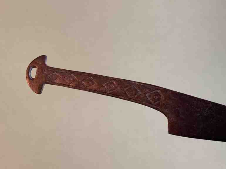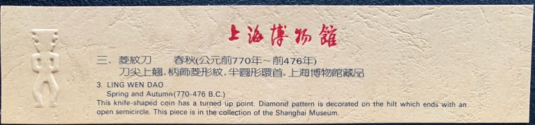 Это — копия монеты в форме ножа, которые были в ходу в Китае между VIII и V веками до н. э., то есть больше 2500 лет назад. Нож из металла, 13 см в длину и вполне может открывать письма. Сувенир приобретен в магазине Шанхайского музея, и на сопровождающей карточке заглавная надпись красным — это название прославленного заведения, где хранится оригинал.