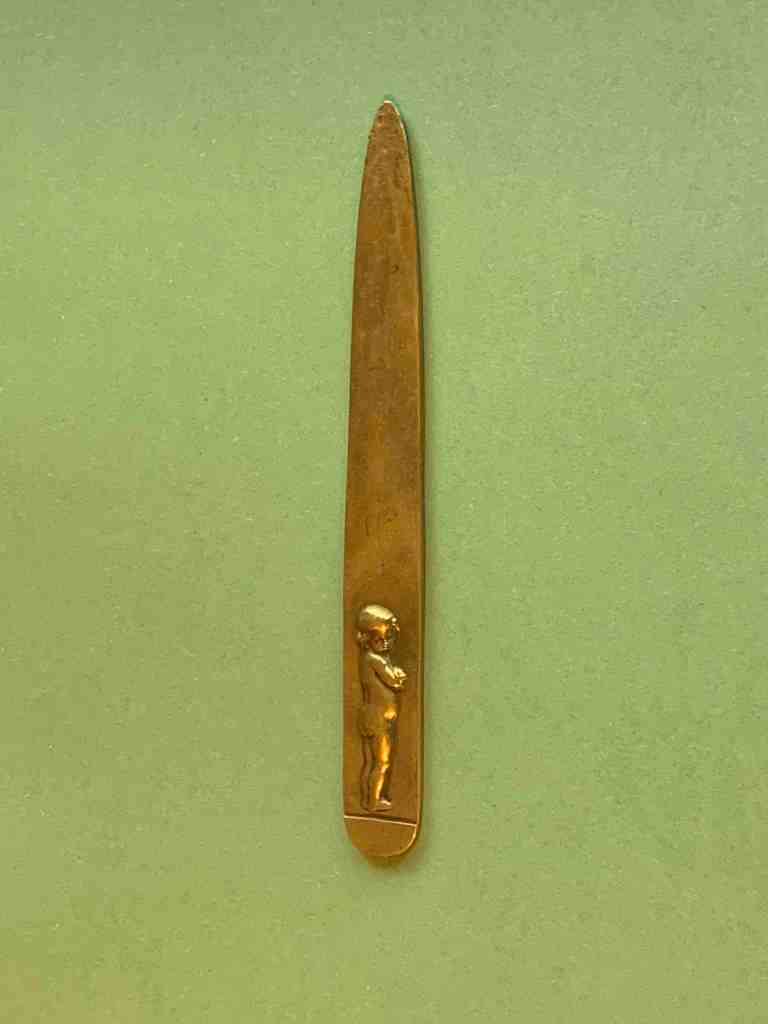Изящный бронзовый открыватель писем с рельефом ребёнка по мотивам скульптур и рисунков Эдме Бушардона. Справа от фигуры ребёнка — надпись BOUCHARDON.