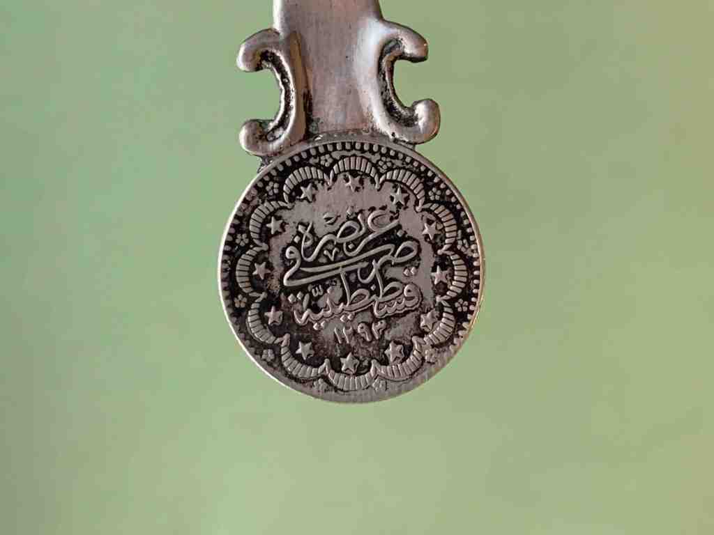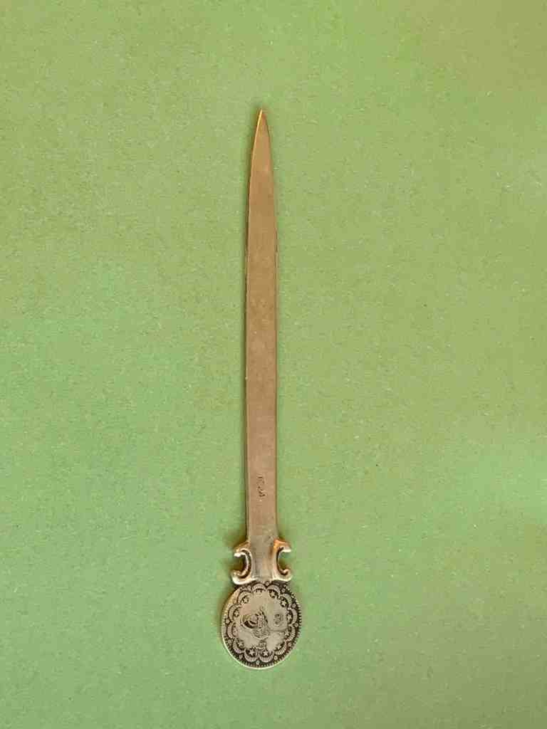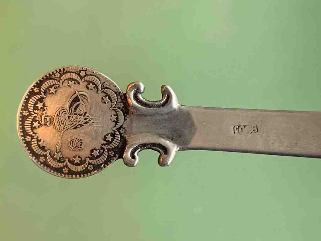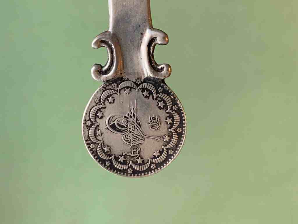 В ручке этого прекрасно сохранившегося серебряного открывателя писем — серебряная же монета Османской империи достоинством 5 курушей, отчеканенная в 1875-76 году в Константинополе (совр. Стамбул, Турция).