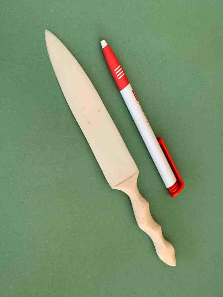Длина предмета — 22,5 см, лезвие достигает 28 мм в самом широком месте. Изгибы змеи позволяют удобно располагать пальцы руки при использовании открывателя писем — четыре пальце с одной стороны рукоятки и большой палей с другой.