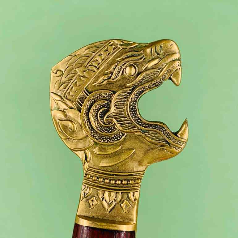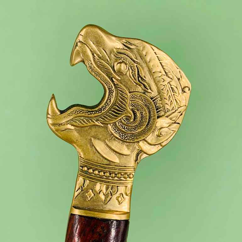 Непонятной породы изящно исполненное существо в короне открыло пасть не совсем естественно и подозрительно симметрично. У автора даже появилась теория, что это — открывашка для бутылок пива. Изогнутое латунное лезвие и вставки из красного дерева на рукоятке намекают на восточное происхождение этого крайне необычного открывателя писем. Красивая вещь.