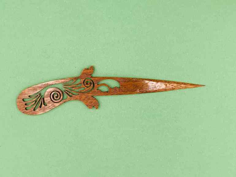Длиной 20 см, этот открыватель писем имеет, для деревянного предмета, необычно тонкое и острое лезвие.