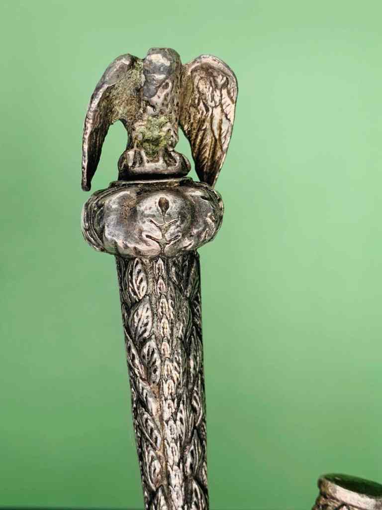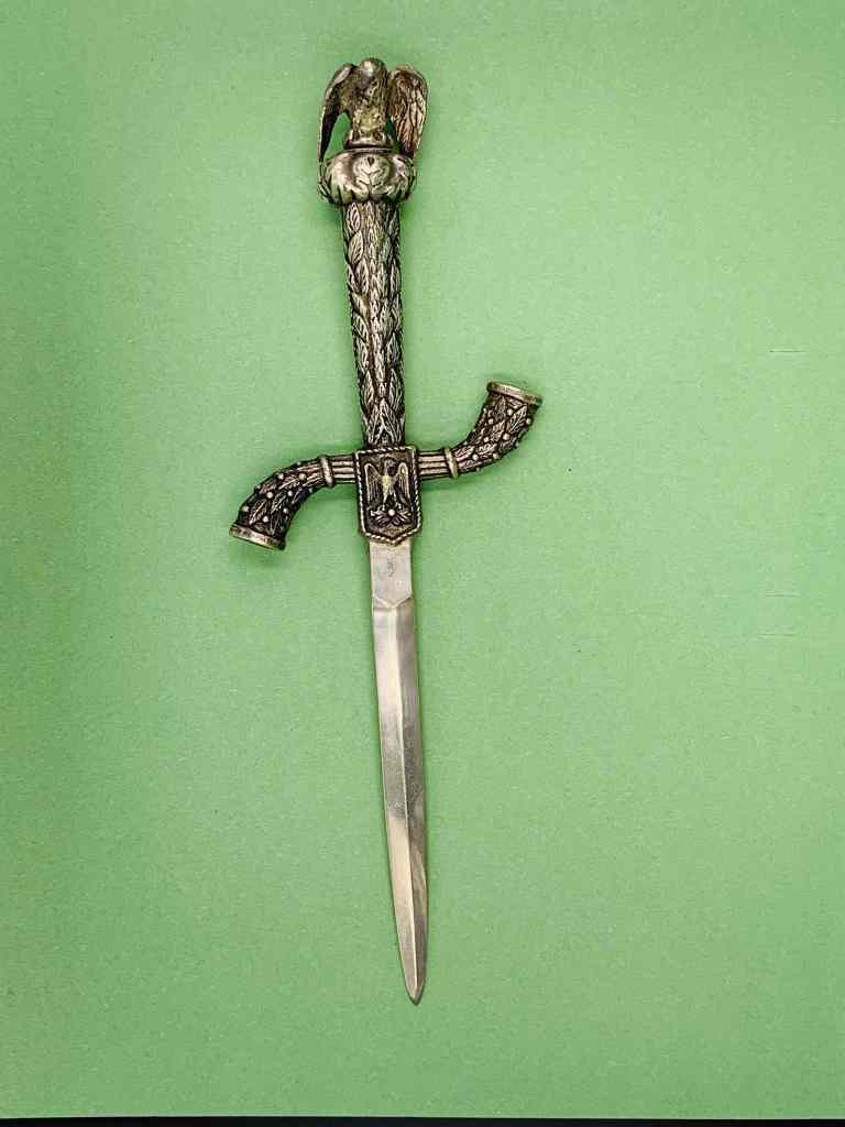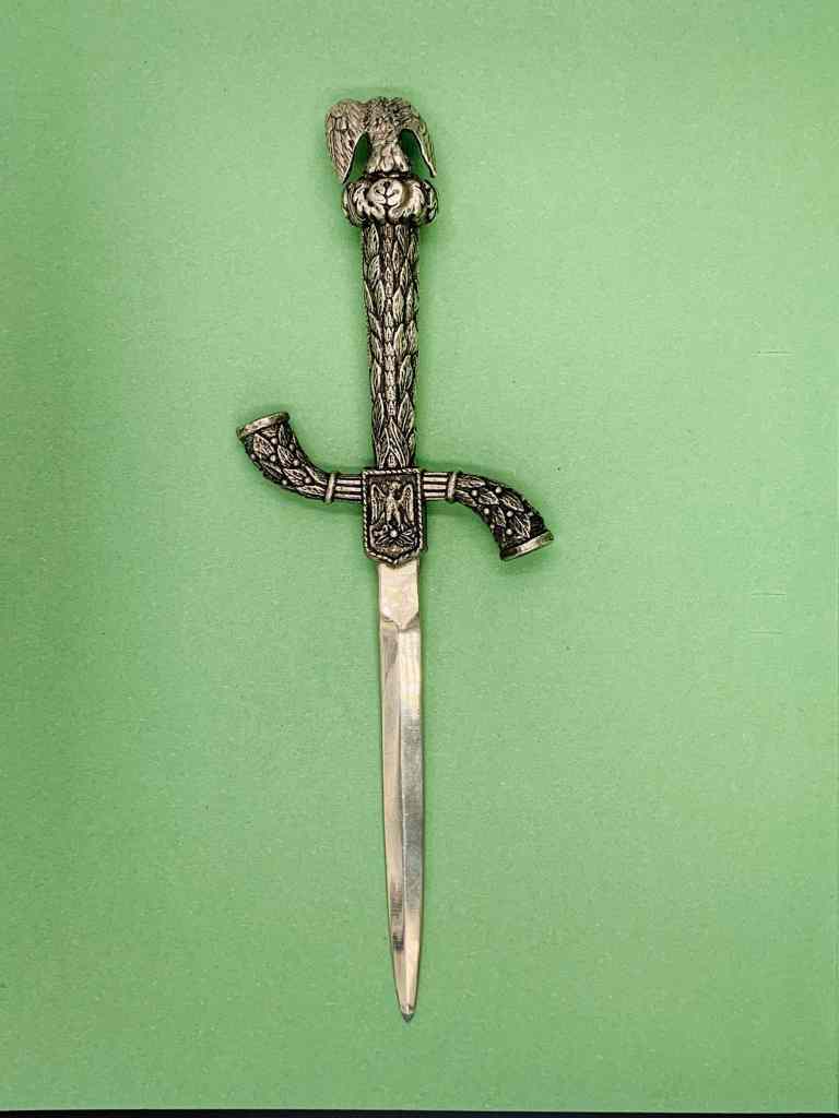 Массивный открыватель писем в форме кинжала с причудливой и тяжёлой рукояткой, украшенной листьями и двумя орлами: один украшает щит в основании рукоятки, второй — сидит на её торце.