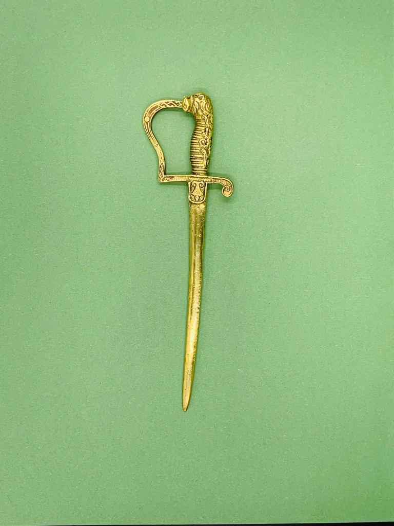 Рукоятка этого небольшого открывателя писем удобно принимает указательный и средний пальцы руки. Длина всего предмета — 19 см. Затупившийся, не раз погнутый, испещрённый отметинами времени, скорее всего, он датируется XIX веком.