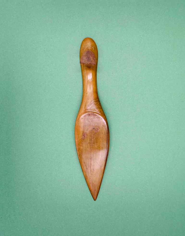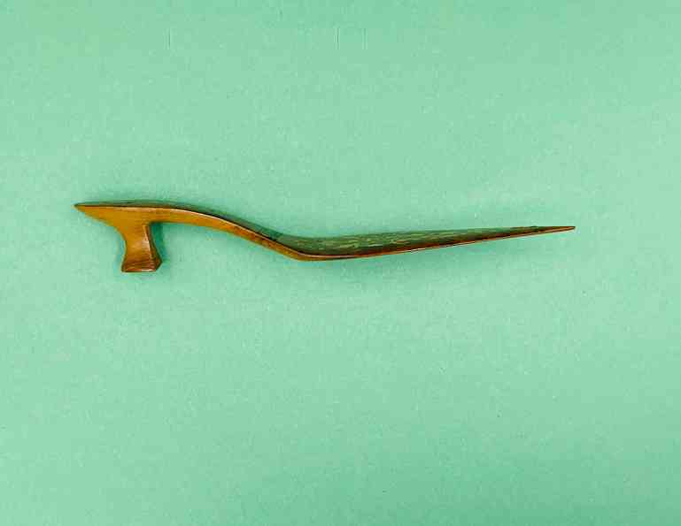 Изящный образец открывателей писем, которыми славился итальянский курортный городок Сорренто между мировыми войнами. Рисунок дерева на подошве похож на древесину оливы. Длина туфельки — чуть меньше 20 см.