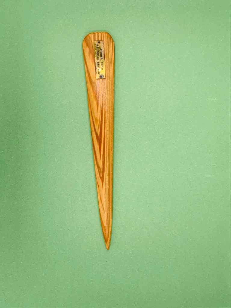 Этот открыватель писем — простой кусок дерева с латунной табличкой, свидетельствующей о непростой судьбе. Материал этого предмета служил частью отделки легендарного корабля «Великобритания» (Great Britain).